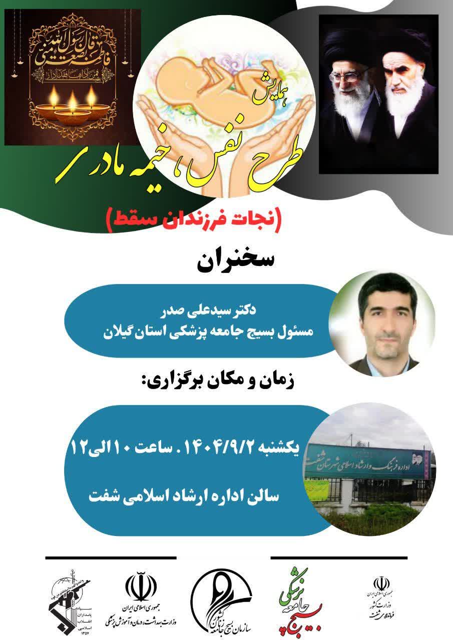 به گزارش روابط عمومی شبکه بهداشت ودرمان شهرستان شفت، همایش یکروزه  "طرح نفس ، خیمه مادری "  به مناسبت هفته بسیج (29 آبان لغایت 5 آذر)   و  به همت بسیج ناحیه مقاومت سپاه شهرستان شفت و بسیج جامعه پزشکی شهرستان با حضور مسئولین استانی و شهرستانی برگزار می گردد.